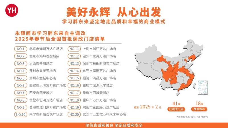 永辉超市日前发布了乙巳蛇年首批调改门店名单,共计20家门店,涉及15个城市。其中,包括了武汉、太原、南宁、开封、温州、东莞、绵阳和福清8个新晋调改城市,届时,调改店将覆盖26个城市。