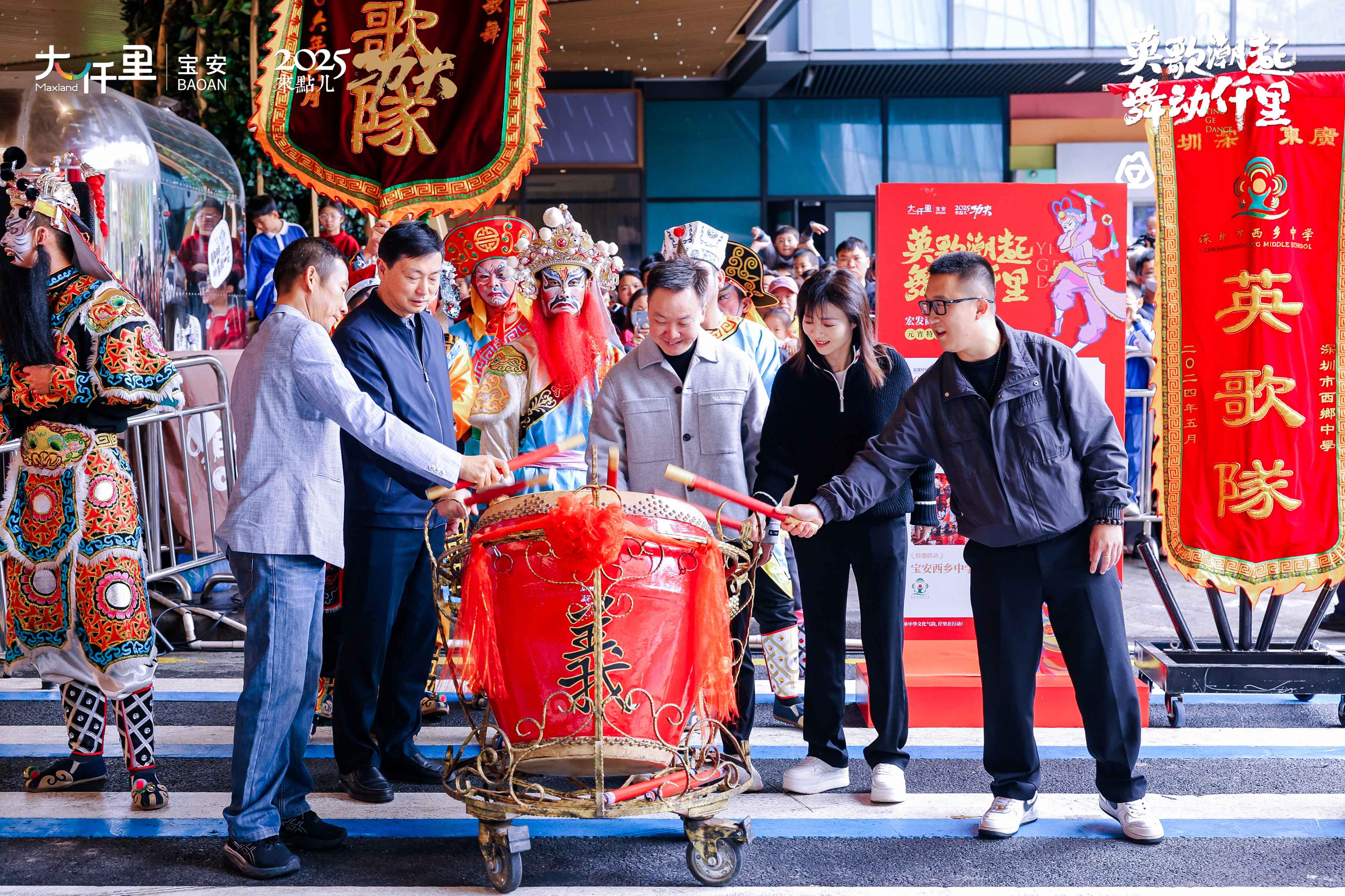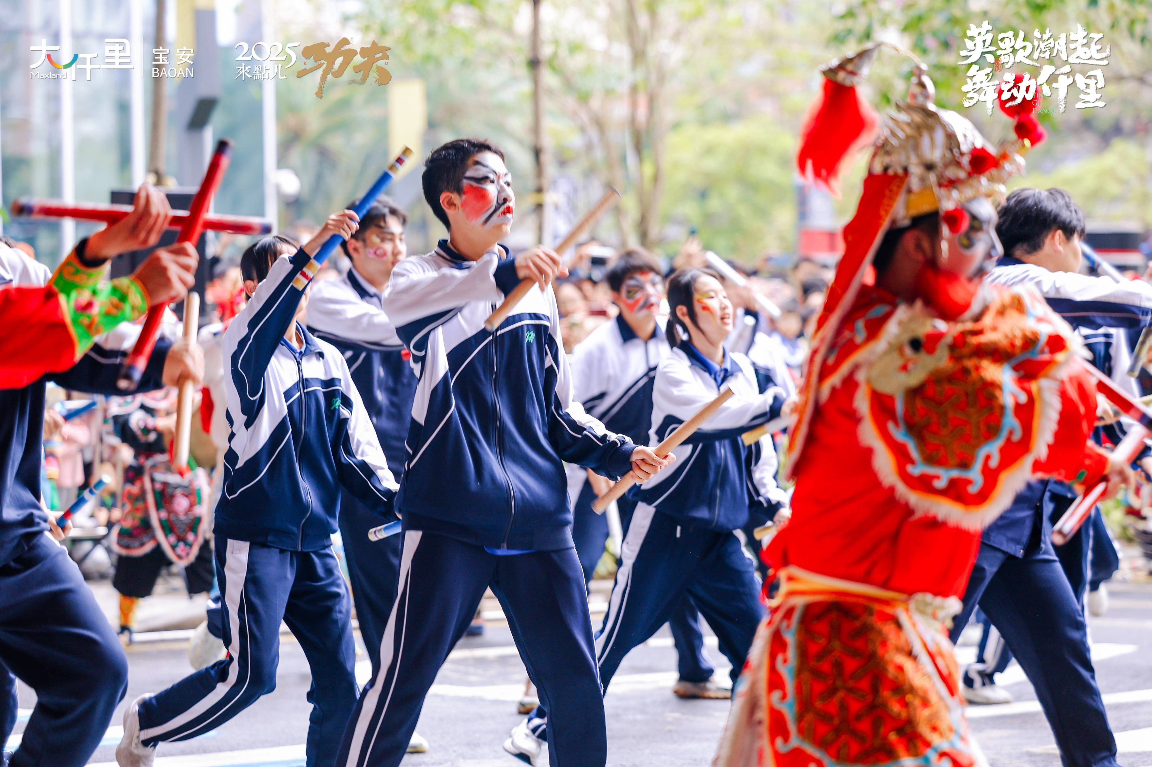 非遗赓续,传承之火生生不息。此次宝安大仟里还邀请了西乡中学校园英歌队首出校园亮相,并与后溪英歌队表演互动。非遗传承人与校园后生同台梦幻联动,是弘扬、是传承,是传递、是接力,深圳学子身穿校服挥动英歌舞槌,与后溪英歌一同舞出非遗风采,共扬华夏之光。