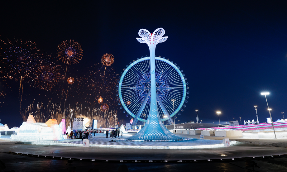 随着哈尔滨第九届亚洲冬季运动会启幕,主火炬塔“雪韵丁香”被点燃,第二十六届哈尔滨冰雪大世界再添一热门打卡地。在哈尔滨冰雪大世界亚冬会圣火点燃区,不仅有主火炬塔“雪韵丁香”,还设计建造了8组冰雕景观,景观造型分别为第一届到第八届亚冬会的主要场馆以及对应的标志、吉祥物等,吸引了众多国内外游客前来打卡拍照。