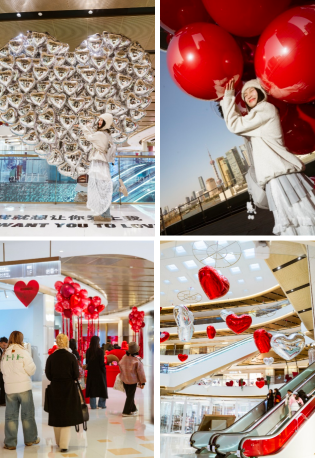 从缀满红色气球的入口启程,沪上情侣们将开启一段爱心、玫瑰与彩带交织的甜蜜旅程。与爱人携手漫步于BFC,随处可见银红交织的爱心气球如星雨般坠落,让爱在浪漫的氛围中悄然绽放。