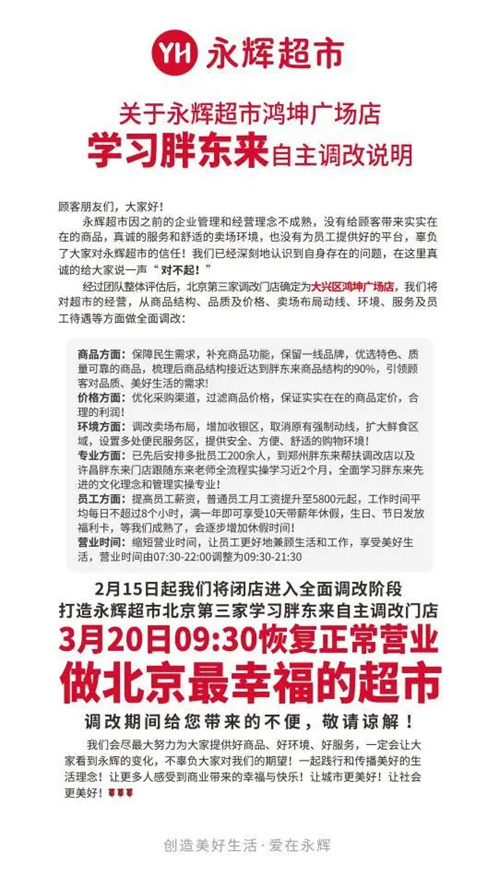 新一年,北京商超正加快调改步伐。记者2月13日从永辉获悉,位于大兴区鸿坤广场的永辉超市2月15日将进入闭店调改阶段,计划于3月20日上午9点半恢复正常营业,这将是北京第三家永辉版“胖东来”。
