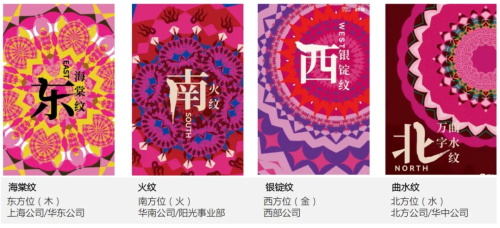 更联合全国7大区域(四大方位)围绕好运新生主题,加入在地文化元素定制出属地型创意纹样,即东方位「海棠纹」,寓意富贵满堂;南方位「火纹」,寓意平安吉祥、生活红火;西方位「银锭纹」,寓意生活富足美满;北方位「万字曲水纹」,寓意吉祥长寿、财源不断,多元联动叠加凝练成百钱好运宝藏纹样,带大家「发现生活无尽藏」,更添一份新年的好运和祈愿。