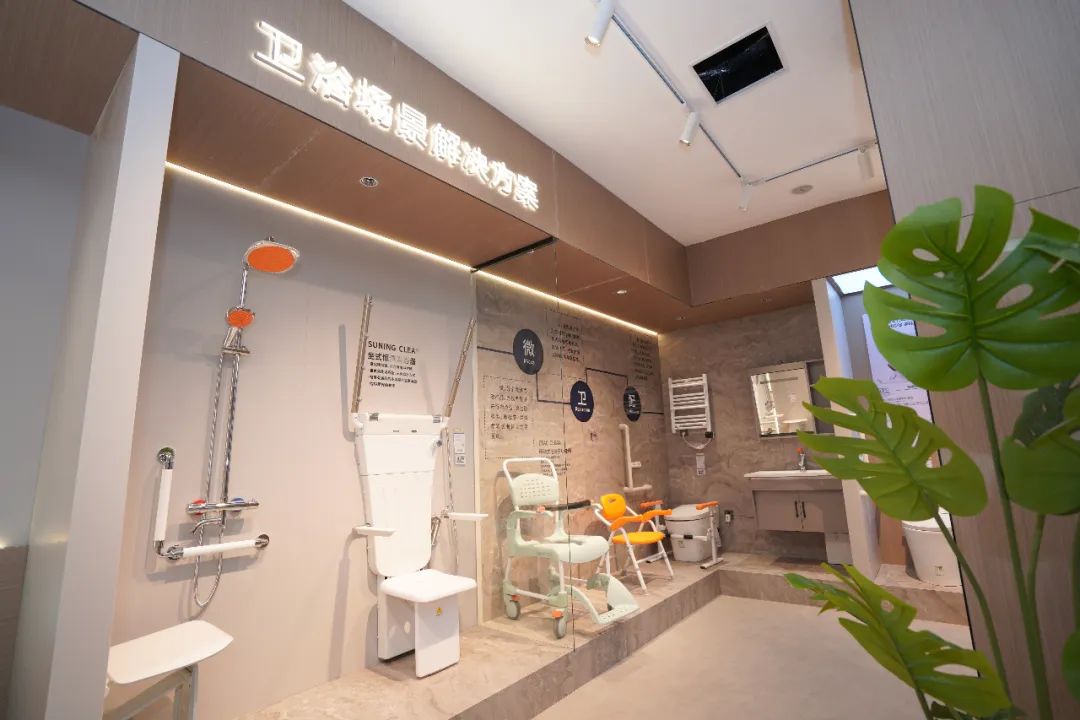 面对政策引导与市场需求,苏宁易购将适老化改造作为2025年服务升级的重点方向,通过门店业态创新,整合卫浴安全、睡眠健康、客厅活动、出行辅助四大高频生活场景,联合欧姆龙、科堡、九牧等品牌推出场景化解决方案。区别于传统单品销售模式,“苏宁私享家”提供从方案设计到安装交付的一站式服务,例如整合折叠洗澡椅、智能坐便盖等刚需产品的卫浴安全套餐,有效解决消费者跨品牌采购带来的安装协同难题。