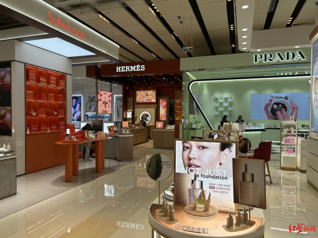 2月26日,记者在现场看到,群光广场1层入驻的主要是一线化妆品牌,包括香奈儿、迪奥、阿玛尼、雅诗兰黛、YSL、TOM FORD、SK II等。