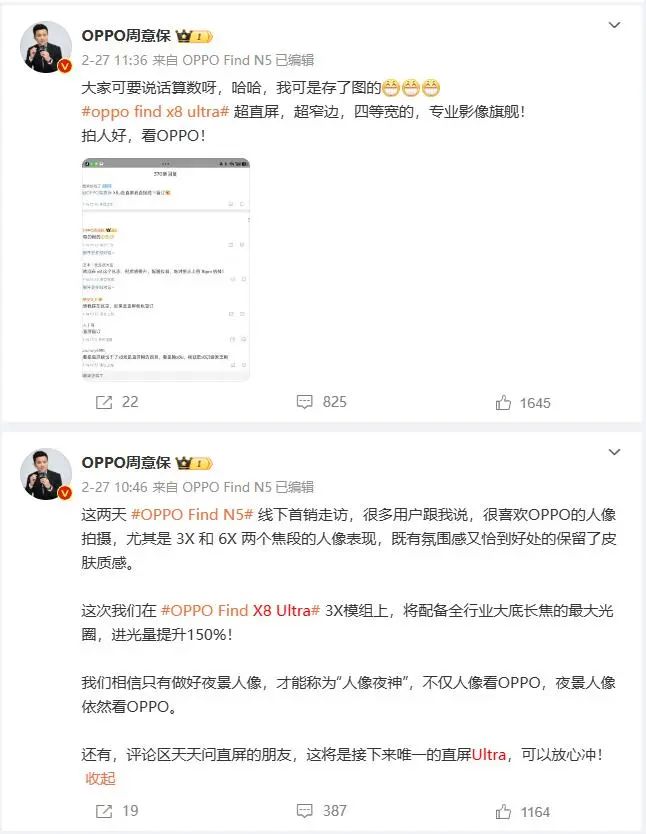 除此之外,OPPO Find系列产品负责人周意保在近日还发文透露,在Find N5之后,全新的影像旗舰Find X8 Ultra也即将到来,按照将定于4月份发布。据了解,Find X8 Ultra将是当下国内市场唯一的直屏Ultra,并且延续了行业唯一双潜望的配置,其中3倍镜头更是做到了行业的最大光圈,堪称是“人像夜神”,可以说是非常令人期待了。