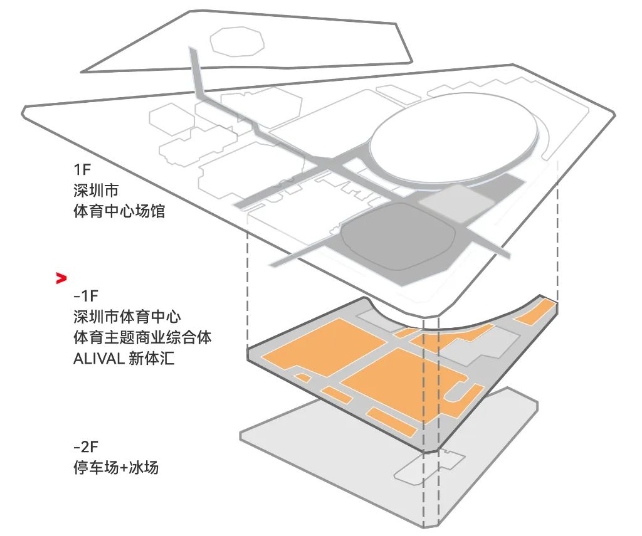 据了解,深圳体育中心总体结构为地下二层,地上一层,其中,一层为体育中心场馆,地下二层为停车场和冰场,配备2000+停车位,地下一层为37700平米的商业部分ALIVAL新体汇,规划有100+个商户,以“国际赛演+湾区赛事+社群活动+俱乐部IP”四大客流引擎,围绕趣潮流新潮互动社交点、悦生活合家欢聚体验圈、i体验运动旗舰活力场、最体育先锋体育聚集地、慢时光休闲运动游乐园等五大主题,意在构建国内最全运动专业设备设施集合地、最热门体育爱好者欢庆据点、推广最健康生活方式的粤港澳大湾区超级体育主题商业综合体。