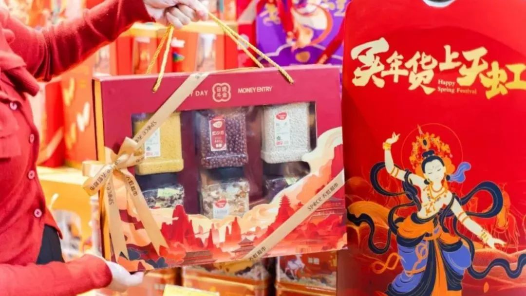 一方面,天虹年货节聚焦“年货”这一春节年味的重要载体传承非遗文化,充分发挥天虹超市的资源优势,线上,消费者完成打卡任务解锁年货券,线下,各大商场联动超市业态推出年货福利、举办非遗年货市集,充分撩动逐渐年轻化的年货采买主力军,并形成“年货清单”的社交讨论。与此同时,sp@ce超市推出“敦煌艺术馆联名礼盒”,更是直接将非遗IP和天虹年货进行绑定,成为爆款产品。