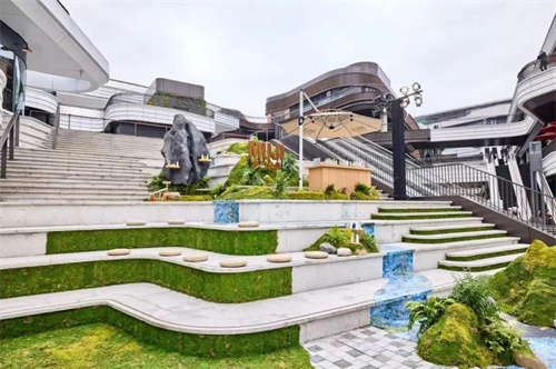 通过秸秆砖与再生材料的结合打造环保美陈装置,绿植与花艺融合错落分布在阶梯之上,用户穿梭其间感受犹如漫步山谷间的惬意与松弛,感受一场绿意换然的自然之行。