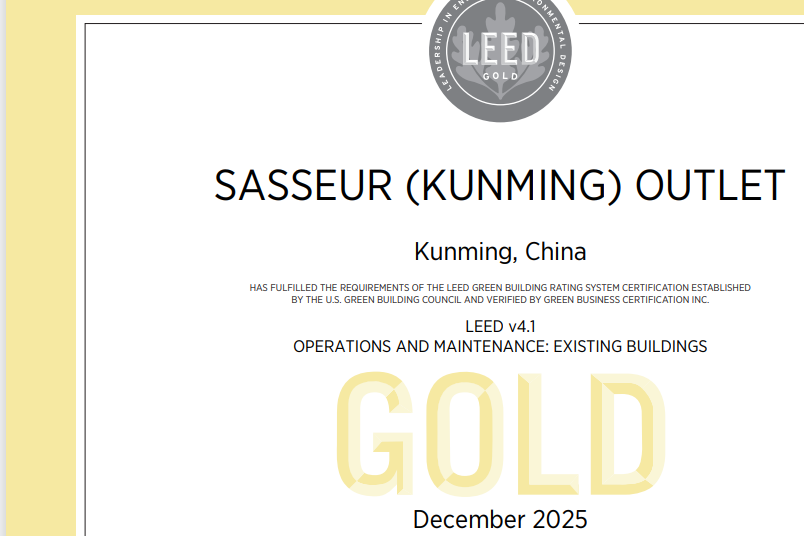 近日,砂之船集团旗下标杆项目——砂之船(昆明)奥莱正式获得由美国绿色建筑委员会(USGBC)颁发的LEED v4.1运营与维护(O+M)金级认证。这不仅是砂之船集团在全国范围内首个获得LEED金级认证的奥特莱斯项目,更标志着其在可持续发展与绿色建筑运营领域迈出里程碑式的一步。